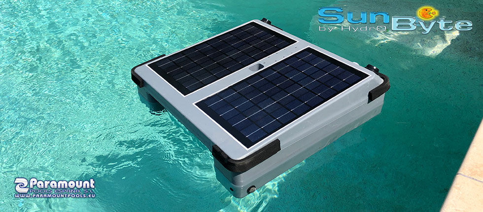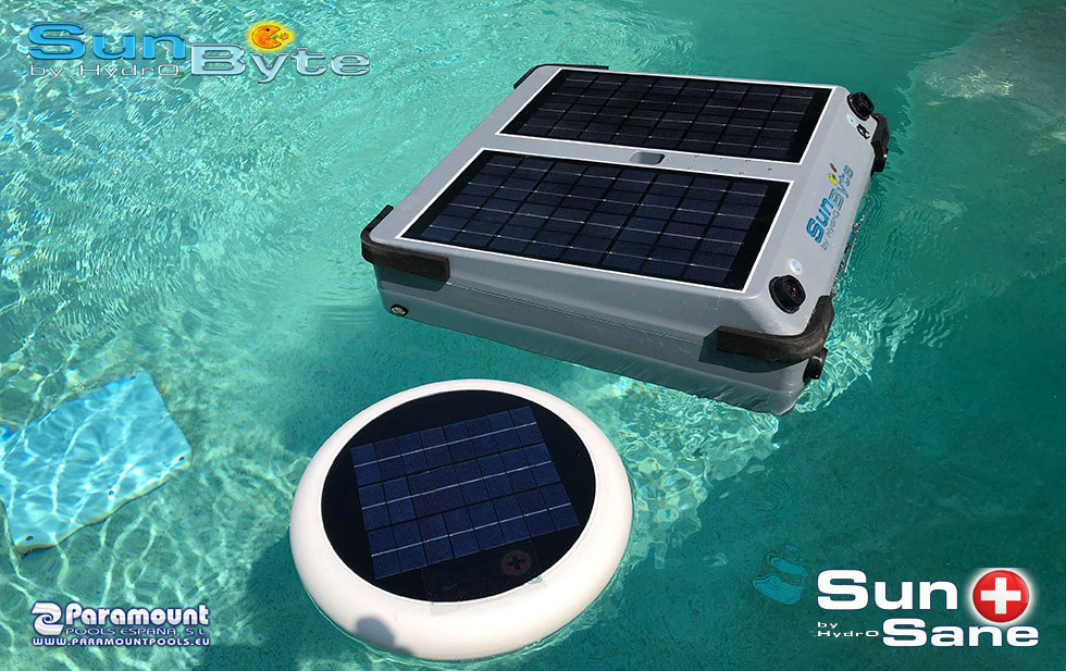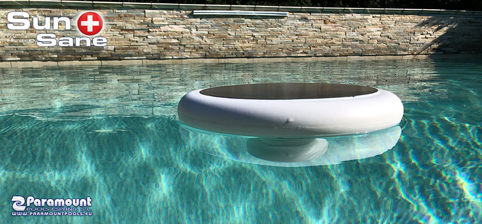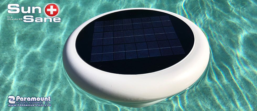 We talk about a Solar Self Powered Sanitizer that oxidize impurities that are into the pool water. The product it is an floating electrolyze device that use the sunrays to produce electricity, use the salt (NaCl) present into the water to split the molecule into Chlorine and Sodium. The Chlorine is a popular sanitizer, wide used in swimming pool water disinfection. The device can be used with salt water (which is the indicated use) but also in sweet water. For use in Sweet water, the device is provided by a small containment tank, where the user has to ad common salt.