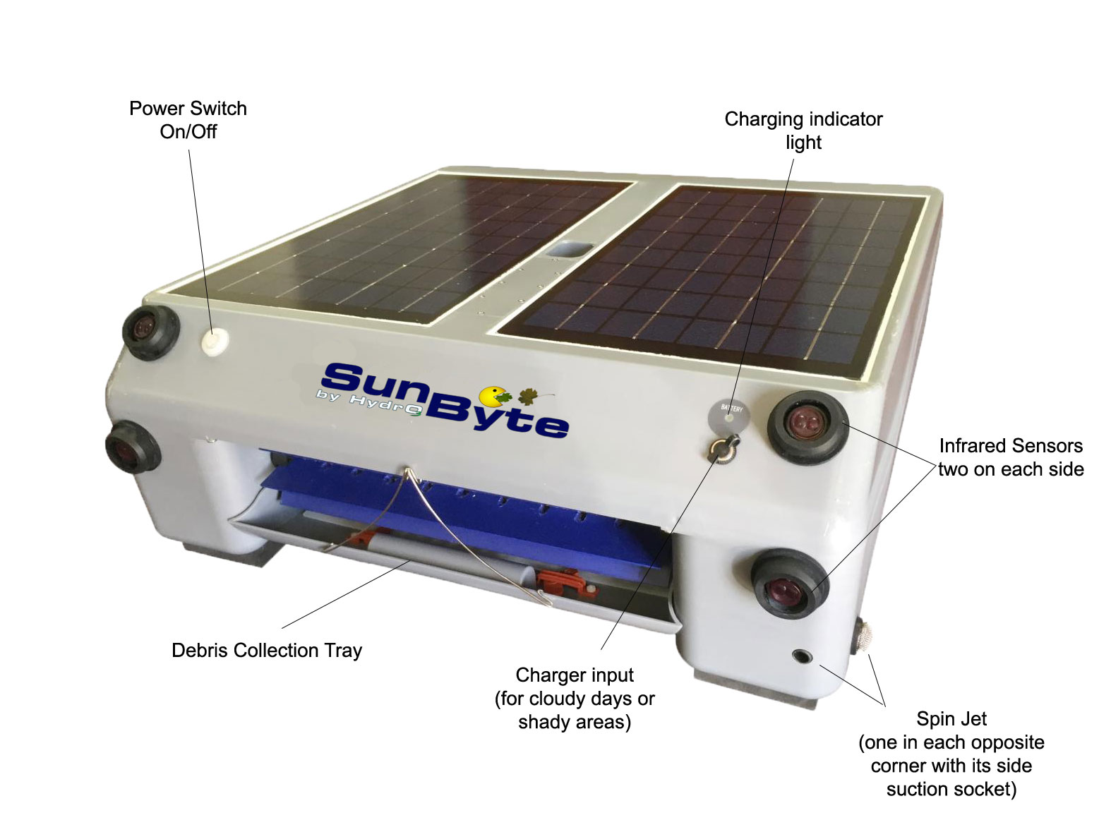 SunByte® is a robot who automatically cleans the water surface, without increasing the electric bill and with no maintenance costs. Provided with Solar Panels on the top, this robot is transforming the solar sunrays into electric energy. This way the robot receives energy while it works during the day and also charge his battery to keep it ready to start working in the next morning. SunByte® it accumulates excess electrical energy inside a rechargeable battery during the day, and with this extra energy, can easily start the work next day.